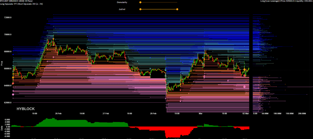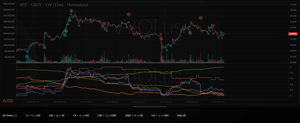 Tại vùng 65K BTC đã xuất hiện tường đỡ khoảng $20M, có dấu hiệu muốn đỡ giá ở đây. Và bên phía trên vùng 68-69k tường bán đã có động thái gỡ bớt đi. Dấu hiệu này khá ủng hộ cho việc BTC có thể có nhịp hồi lên test lại kháng cự ở 68-69k 1 lần nữa.