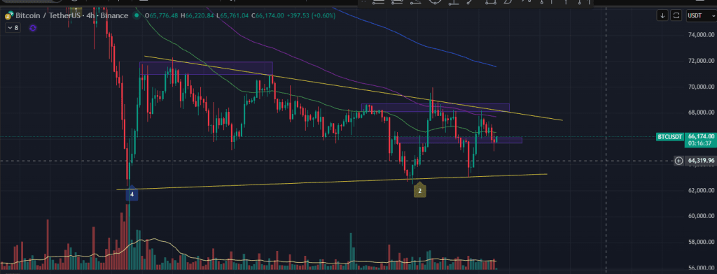 Ở H4 thì BTC chạy vẫn đang chuẩn trong mô hình nêm giảm. Nên là trong 1-2 ngày tới mình nghĩ giá vẫn sẽ chạy trong cái nêm này chứ chưa breakout sớm