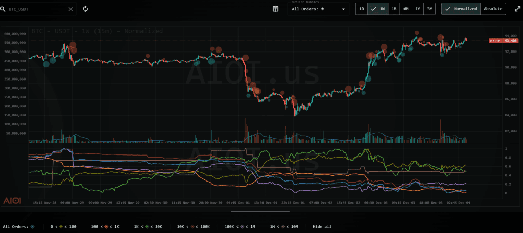 Nhịp đẩy tiếp giá BTC từ 86 lên đến 93K các luồng vol lớn là đỏ, tím, nâu vẫn không có sự tham gia mua vào đáng kể, thậm chí còn bán thêm ra. Cho thấy nhịp đẩy 10K giá này của BTC không có sự tham gia mua nhiệt tình bởi các tay to, giá đi lên giá dễ bởi các tường bán rất trống, kèm theo lực bán lớn từ lệnh market chưa quay trở lại. Việc luồng vol lớn mua market không tăng trưởng mạnh ở giai đoạn giá ở 8x đang khiến cho mình không có lòng tin nhiều vào việc BTC sẽ tiếp tục tăng mạnh trong ngắn hạn.