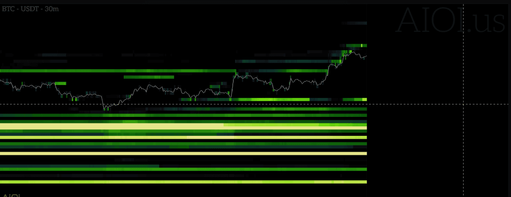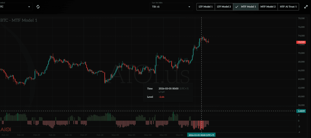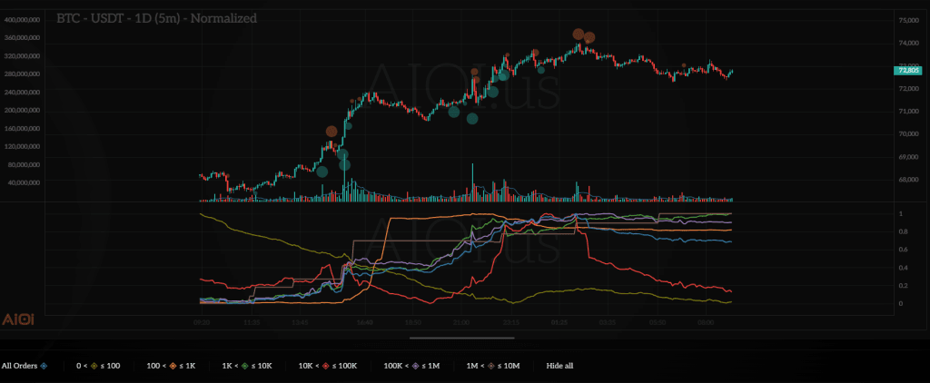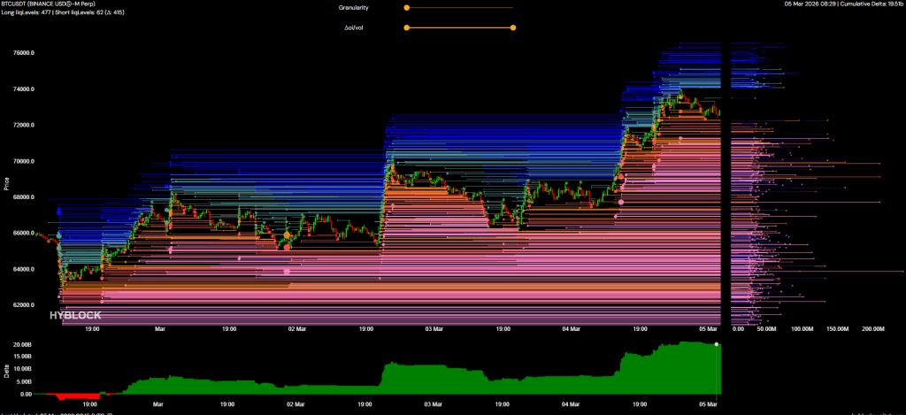 Hiện tại tường bán đáng chú ý gần nhất là tường $20M ở 75K, ở bên dưới cho đến 65K thì tường mua đang khá trống. Nếu giá đẩy qua được tường ở 75 này thì tỉ lệ khá cao giá sẽ tiếp tục đi lên đến vùng kháng cự tiếp theo ở mốc 78k