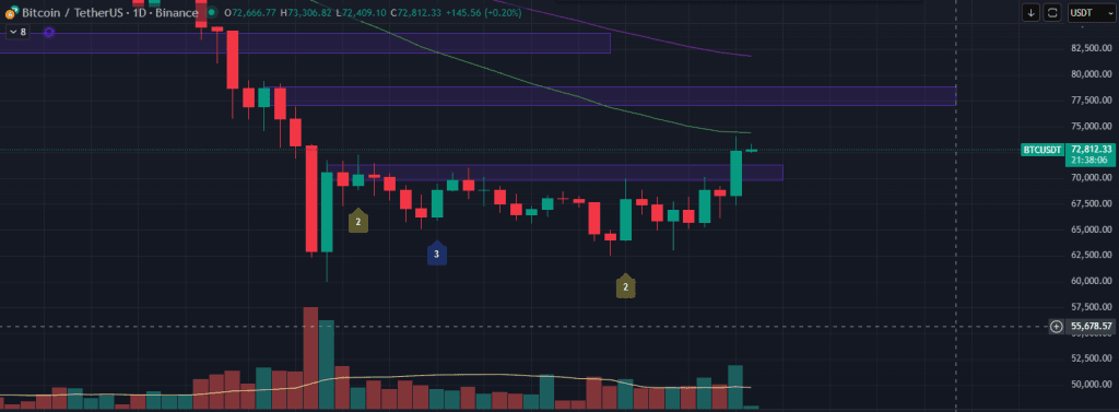 Trên khung D đường giá đang gặp kháng cự ở 74k5 là đường EMA50, tại đây có thể sẽ khiến BTC có nhịp chỉnh nhẹ