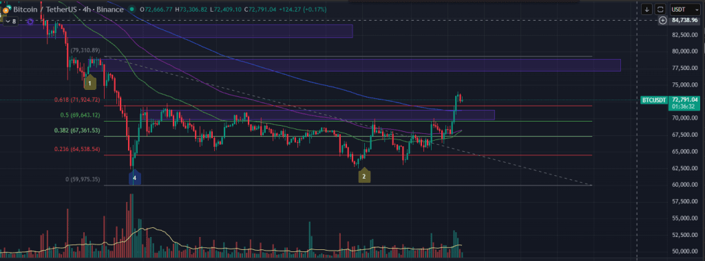 Về đến H4 thì mặc dù BTC chưa quay trở lại được xu hướng tăng, nhưng giá đã phá qua được hết các đường EMA quan trọng, và cũng đã phá qua được fibo 0.618. Rất đẹp để ủng hộ giá tiếp tục đi lên để test vùng kháng cự ở 78K.
