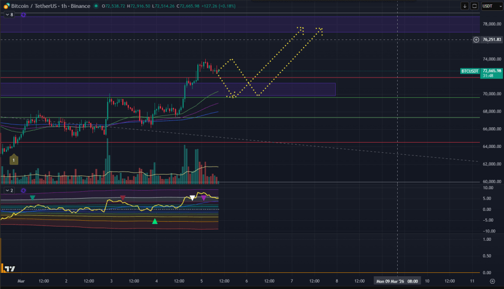 Từ PTKT và CEX Data thì view chạy trong một vài ngày tới cho BTC sẽ là BTC dễ sẽ có nhịp chỉnh quanh mốc 74-75K, và nhịp chỉnh này chỉ rơi về khoảng 70-71K. Sau đó giá sẽ tiếp tục chạy tăng lên mốc 77-78K
