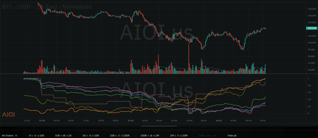Các luồng vol từ lớn đến nhỏ của BTC đều đã quay đầu đi lên sau khi lực bán có vẻ đã khá cạn kiệt. Ủng hộ trong ngắn hạn BTC sẽ tiếp tục hồi nhẹ, vùng 100K tạm thời sẽ vẫn giữ ổn không bị thủng.