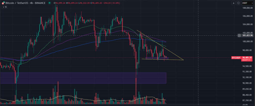Hiện tại BTC ở H4 đang chạy theo mô hình tam giác giảm. Mặc dù giá đang ở hỗ trợ hoàn toàn có thể đánh 1 lệnh Long ở đây. Nhưng đoạn này chúng ta nên chờ đợi nến sẽ chạy đóng nến phá cạnh trên hay cạnh dưới của tam giác này. Nếu giá đóng nến ở dưới khả năng cao sẽ quay lại test 90K. Nếu nến phá được lên trên thì có thể kì vọng 1 nhịp tăng trở lại khoảng 105-106K.
