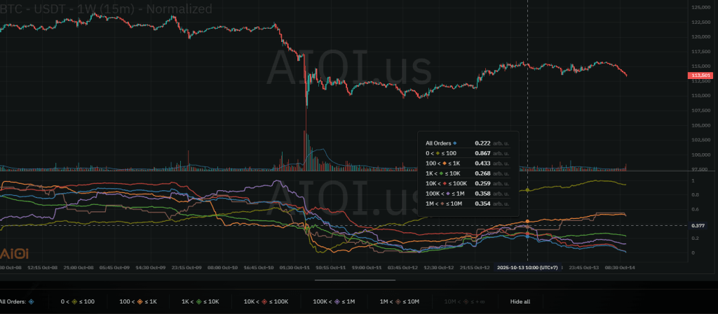 Từ lúc BTC chạm đến 116K hôm qua thì 2 luồng vol lớn là đỏ và tím đã xuất hiện lực bán cũng tương đối lớn. Từ thời điểm giá BTC 116 bán về hiện tại giá 114K 2 luồng vol này bán lệnh market khoảng $300M. Cho thấy trong ngắn hạn BTC vẫn đang có áp lực bán lớn có thể khiến BTC sẽ còn nhịp retest hỗ trợ bên dưới.