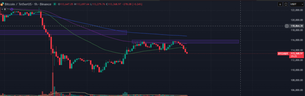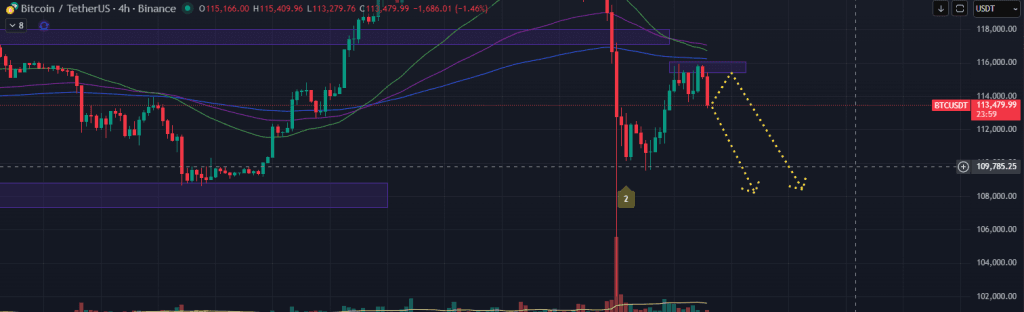 BTC đã sideway trước vùng cản này hơn 1 ngày, trên khung bé thì dừng như này là khá lâu nên lên không được thì lại phải xuống. Và BTC đã có dấu hiệu chuẩn bị gãy khi giá rớt thủng qua 114K