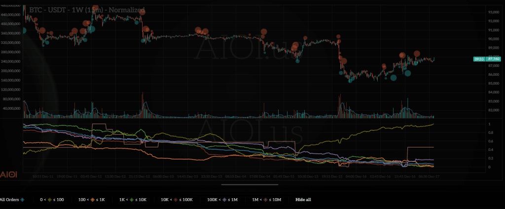 Hiện tại thì vùng bên trên từ 88-92k vẫn đang rất trống tường bán. Việc có khoảng trống lớn phía trên ủng hộ giá vẫn còn có thể hồi lên thêm trong khi bên dưới tường mua thì vẫn đang duy trì liên tục vùng từ 80-85K đang có giá trị loanh quanh $200M.