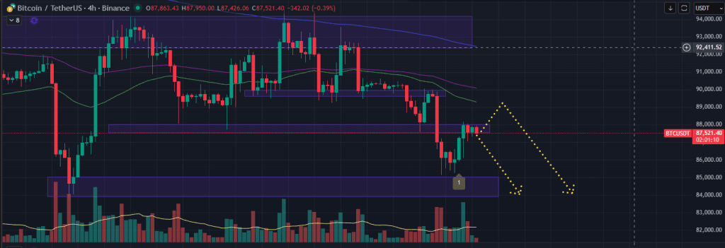 BTC vẫn đang còn khả năng có thể hồi thêm, nhưng xu hướng chính thì vẫn sẽ duy trì ở xu hướng giảm thôi. Cho nên view sẽ là BTC tối đa có thể hồi lên được đến 90K để quét thanh lý, stoploss rồi giá vẫn sẽ giảm tiếp về vùng hỗ trợ ở 83-84K.