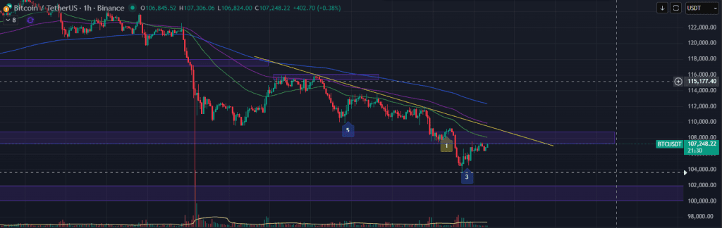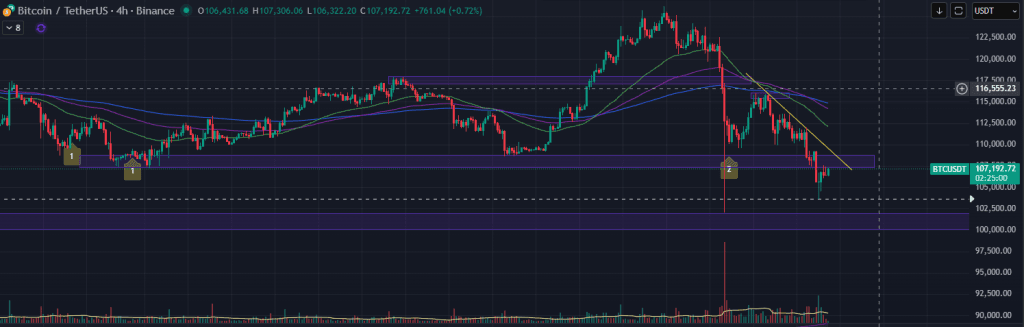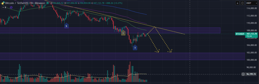 Trên H4 BTC đã mất vùng hỗ trợ 107K, điều này không có gì phải bàn cãi. Mất 107 rồi thì hỗ trợ tiếp theo sẽ là vùng 100-102K, hôm qua thì giá mới quét lửng lơ về 103k5 thôi. Cho nên nhịp hồi nhẹ từ đêm qua đến giờ hoàn toàn phù hợp là 1 nhịp hồi để giảm tiếp.