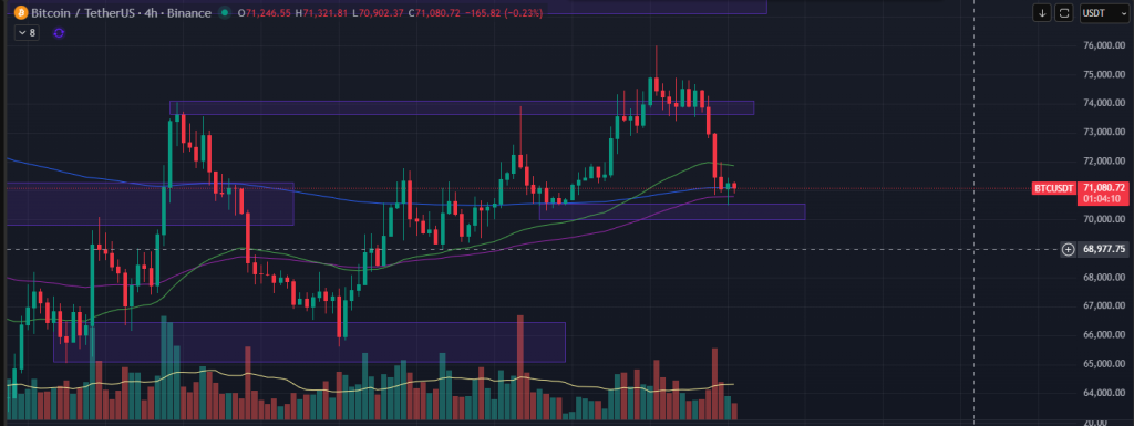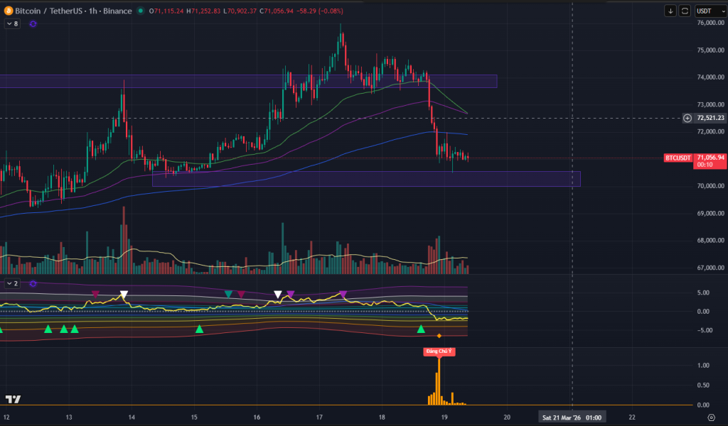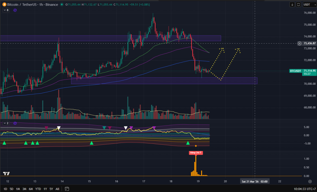 Tại những vùng hỗ trợ quan trọng trong PTKT và đi kèm theo đó là CEX Data cũng có sự ủng hộ, thì rất ít khi BTC sẽ mất vùng hỗ trợ luôn mà không có nhịp hồi xảy ra. Cho nên view hôm nay cho BTC khả năng là quanh mốc 70-71k BTC sẽ phải có nhịp hồi lên ít nhất vùng fibo ở 73K.