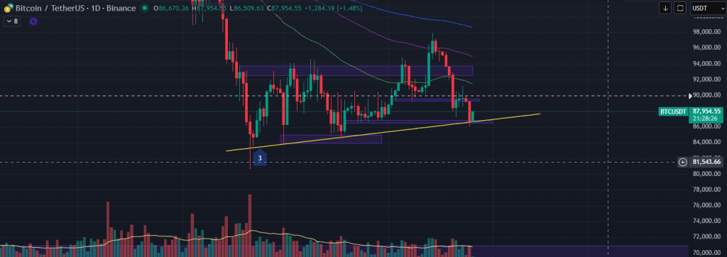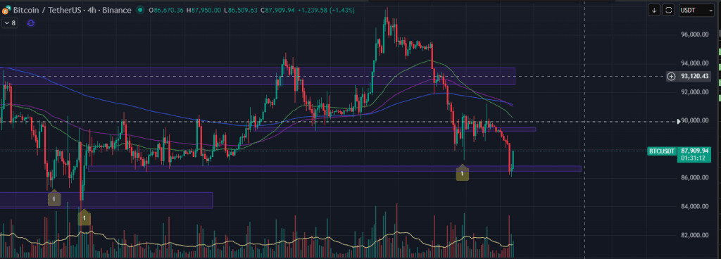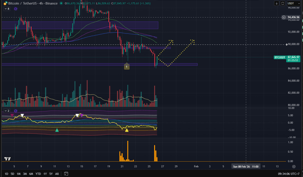 Trước mắt thì không chắc BTC có thể hồi mạnh trở lại để đảo H4 quay lại xu hướng tăng được hay không, nhưng việc có nhịp hồi lên được quanh mốc 90k là khá khả thi. Và nếu BTC thủng đóng nến dưới 85k thì plan sai, khả năng sẽ đổi view BTC sẽ phải bị rơi về lại vùng 80K.