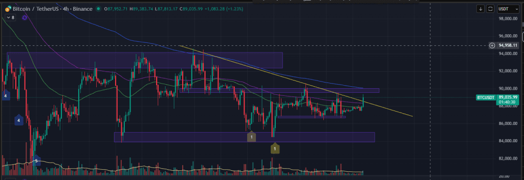 Trên H4 thì BTC đã break qua được trendline giảm. Nhưng nến này vẫn chưa đóng, nên chờ đợi thêm 1-2 nến H4 nữa nếu giá vẫn giữ được trên trendline thì sẽ đẹp để ủng hộ BTC có thể đẩy giá qua kháng cự ở 90K.