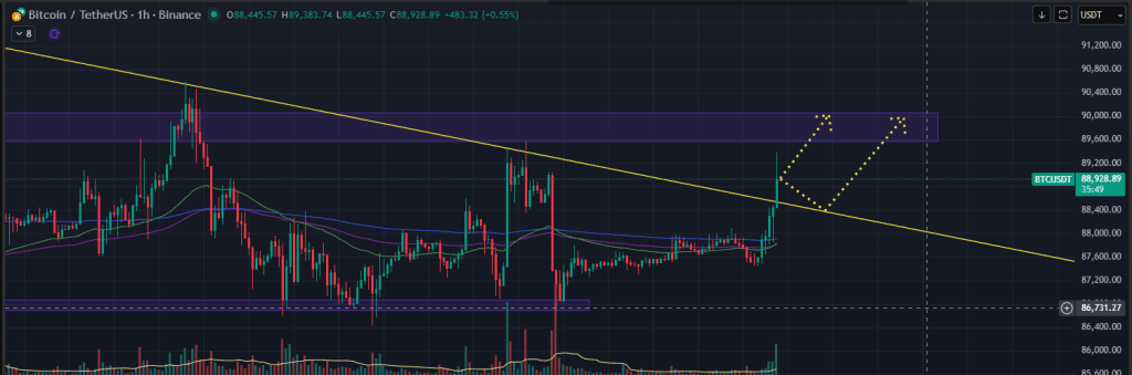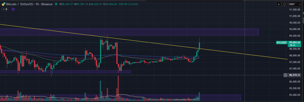 View ngắn thì trước mắt BTC trông khá ổn để sớm lên lại 90K. Nếu phá qua được 90K thì sẽ rất sáng cửa để rất sáng cửa để dễ lên lại 94k.