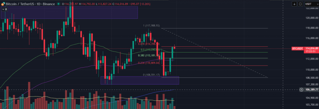 Ở khung D, BTC đang tạm dừng tại fibo 0.618. Nhưng với động lượng hiện tại thì BTC cùng lắm chỉnh nhẹ rồi sẽ phá qua fibo để test lại đỉnh gần nhất ở 117k5-118K.