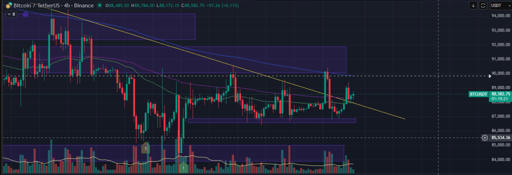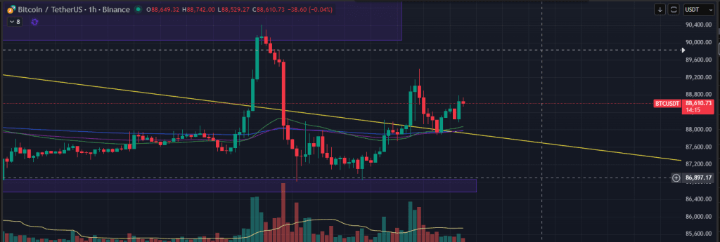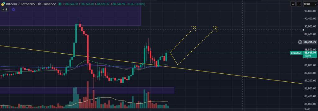Với cấu trúc đường giá chạy hiện tại thì BTC vẫn đang là đã phá qua được trenline xu hướng giảm. Giá giảm không bị rơi thủng khỏi hỗ trợ 87k, nên vẫn đang rất ổn để ủng hộ BTC sẽ còn khả năng cao là sẽ tiếp tục lên ít nhất là test lại 90k